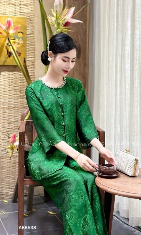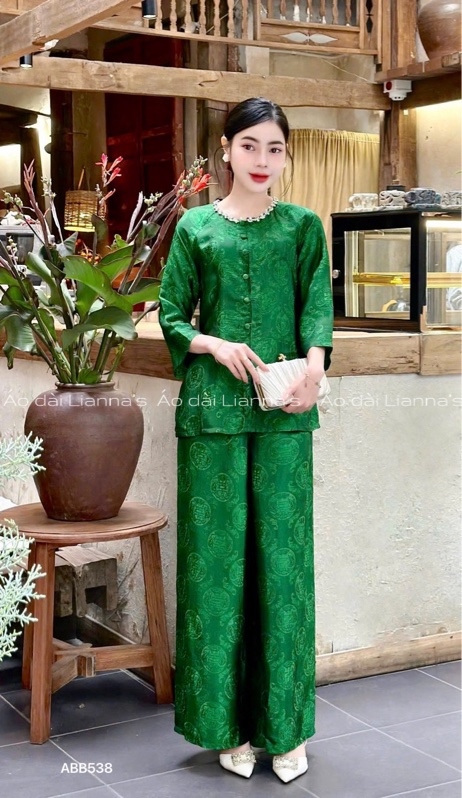 Áo bà ba tơ tằm chữ thọ xanh lá cổ viền đá