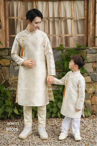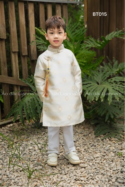 Áo dài bé trai Tết tong kem