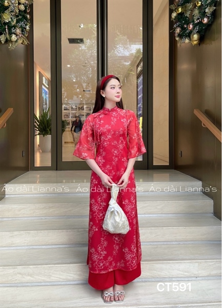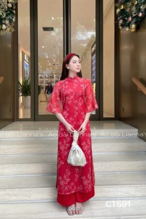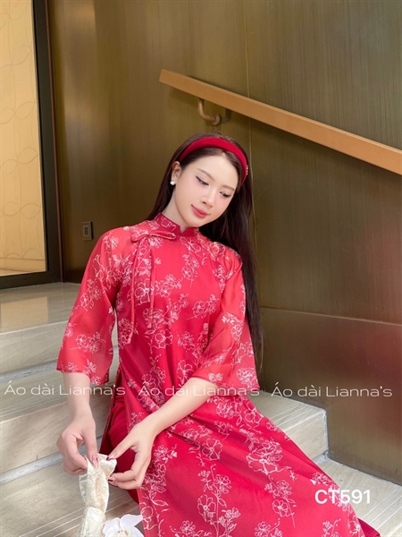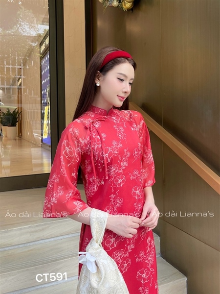 Ao dai cách tan đỏ hoa viên trắng