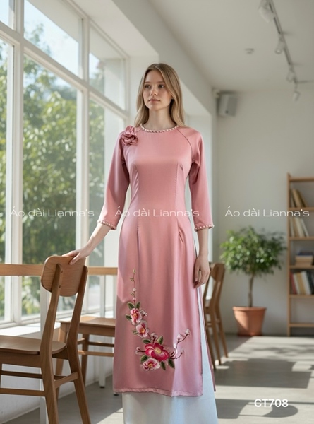 Áo dài cách Tân theu Hồng ruốc