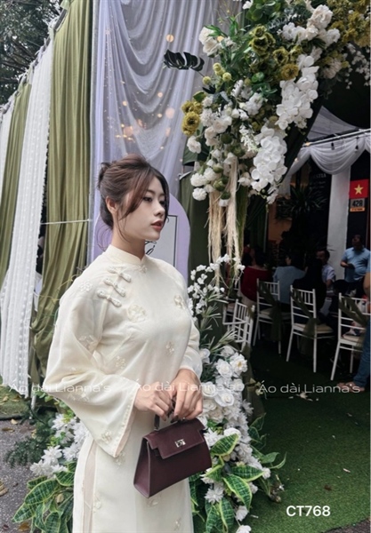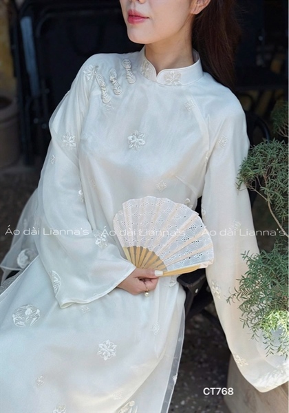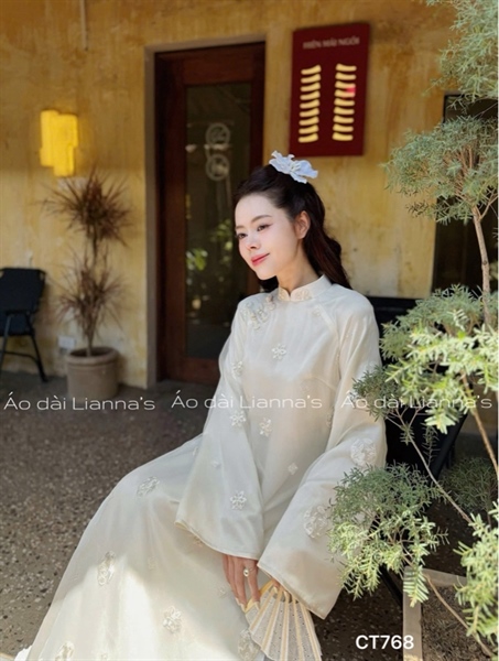 Áo dài cách tân tong kem họa tiết thêu tròn