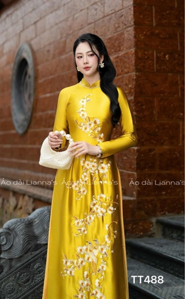 Áo dài cao cấp lua valentino theu hoa vàng gold