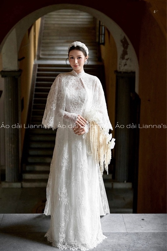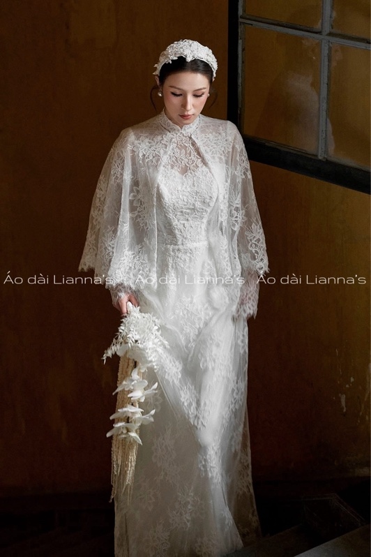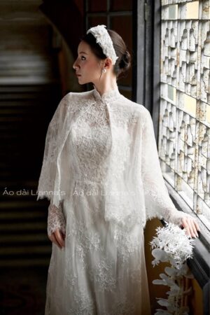 Áo dài cưới ren trắng kèm choàng