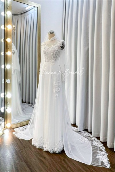 Áo dài cưới được đặt may theo số đo (customized in about 5 weeks).