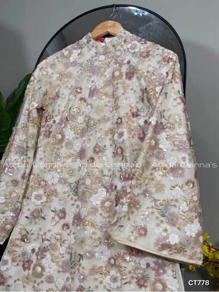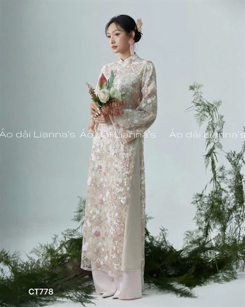 áo dài kim sa hoa nhí nền kem