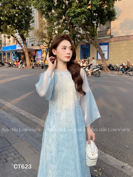 Áo dài suong hoa Hồng tong xanh dương cổ tron thắt bím