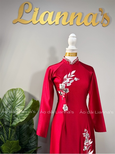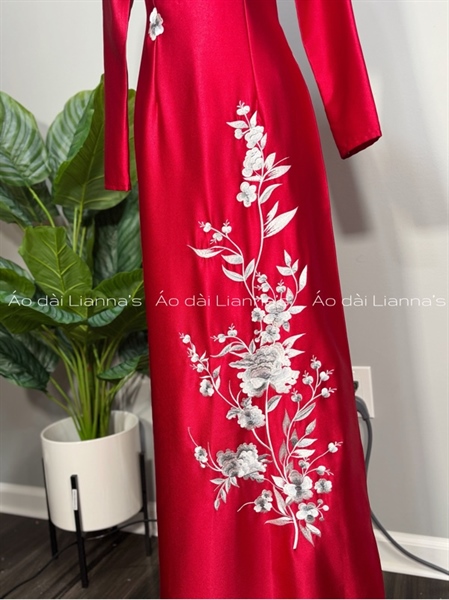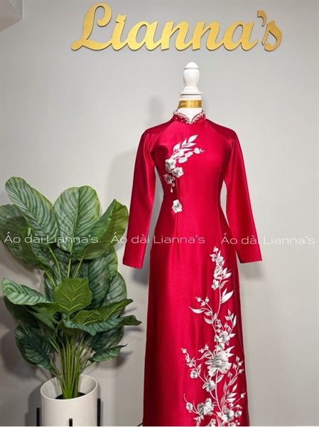 Áo dài thiết kế đỏ lua valentino thêu hoa