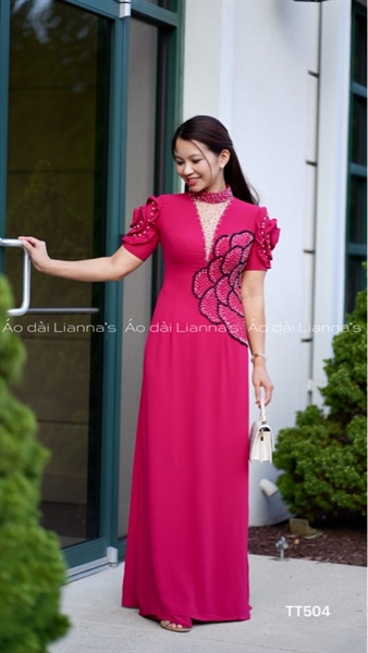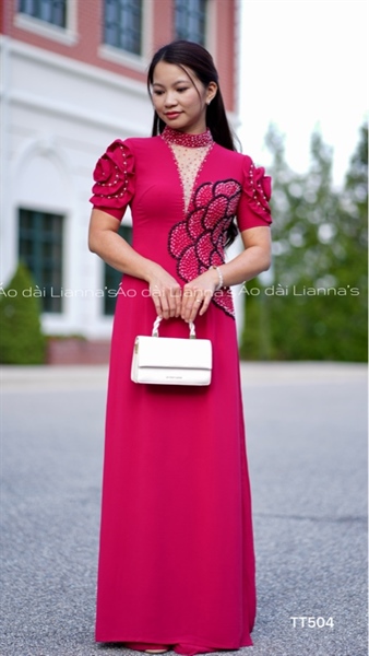 Áo dài thiet kế tay hoa đỏ sen