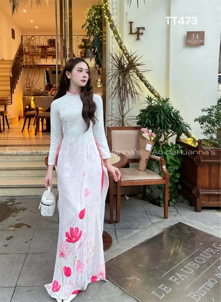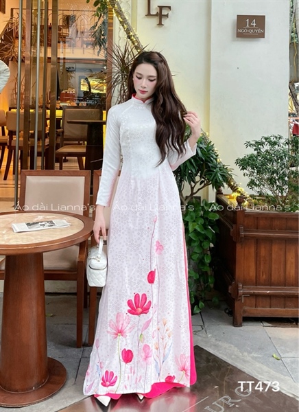 Áo dài trắng hoa sen Hồng in chân tà