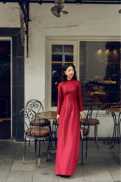 Áo dài truyền thống đỏ đô hoa nhí viền cổ