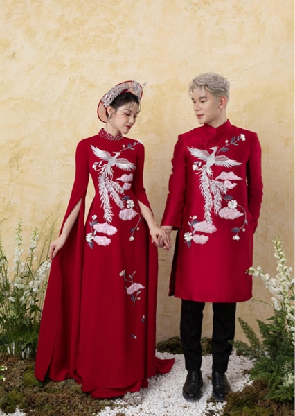 Set áo dài cưới truyền thống tông hồng với chú rể xanh dương
