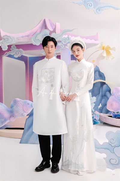 Cặp áo dài cưới hoa sen trắng
