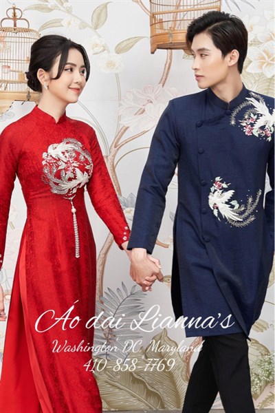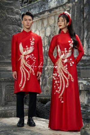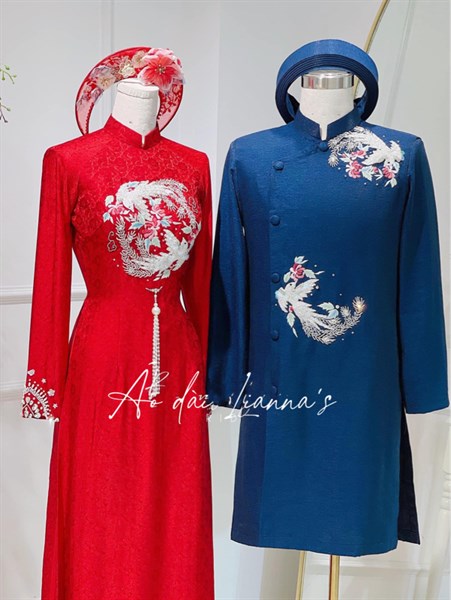 Set áo dài cưới nữ đỏ 1 nam xanh