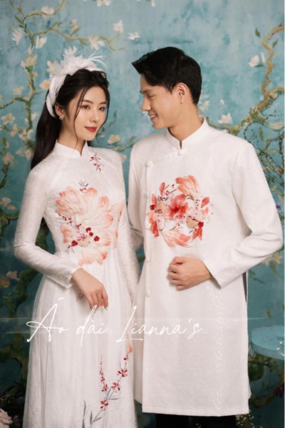 set áo dài cưới dsong ngư – được thêu kết tỉ mỉ sắc sảo . Chất lụa tơ tằm nổi tiếng Hà Đông góp phần sang trọng cho áo cô dâu cùng với aod chú rể là chat vải tacpa sáng bóng đứng form . Mọi thông tin chi tiết – nàng xem tại fb: Lianna’s Bridal