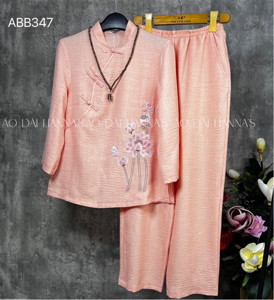 Set đi lễ đũi hồng thêu hoa sen